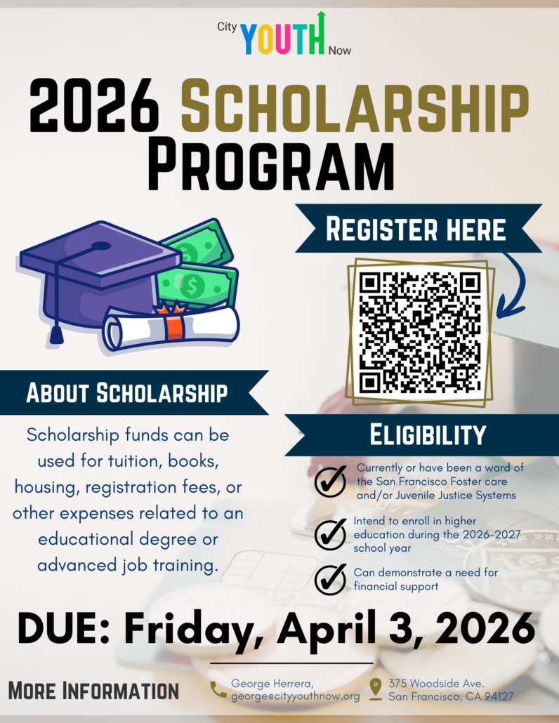 Each year, City Youth Now provides scholarships to youth in San Francisco who are either currently or previously system-involved, or local, community youth who can demonstrate financial need. These scholarships are awarded to help pay for higher education and vocational expenses. In the past, these scholarships have been awarded to approximately five youth per year, with each scholarship ranging in value from $1,000 to $5,000. The scholarship values and quantities may vary on a yearly basis depending on availability and youth need.